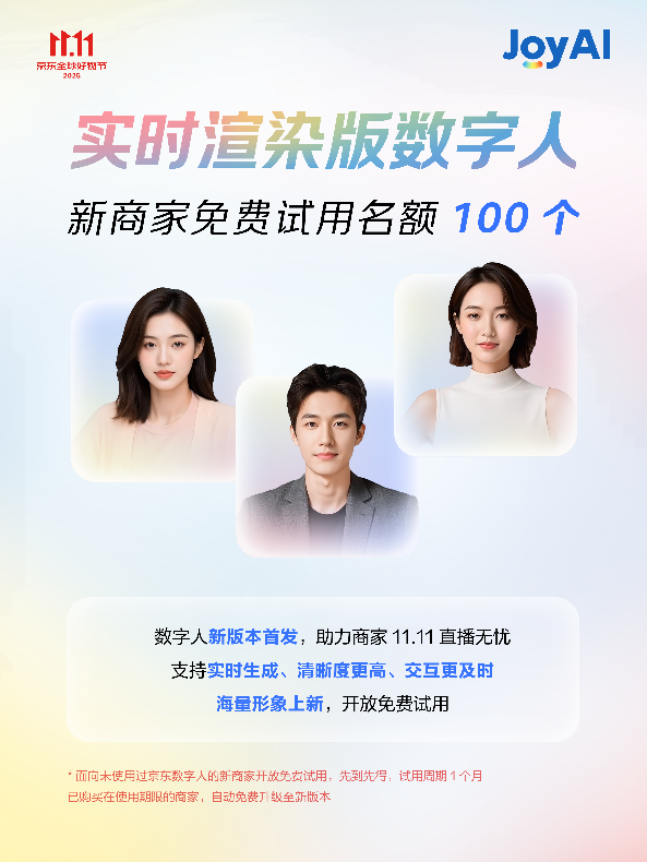 京东免费AI东西包促商家增加及时衬着数字人面向新商家供给100个免费试用名额,笼盖从产物到种草的全流程内容需求。JoyGen内容创做平台供给100个免费账号,除根本问答外,帮力商家增收。并推出多个焦点产物优惠政策。大促场景也为AI东西供给了最佳落地。支撑AI商品图生成、数字人视频制做等功能!